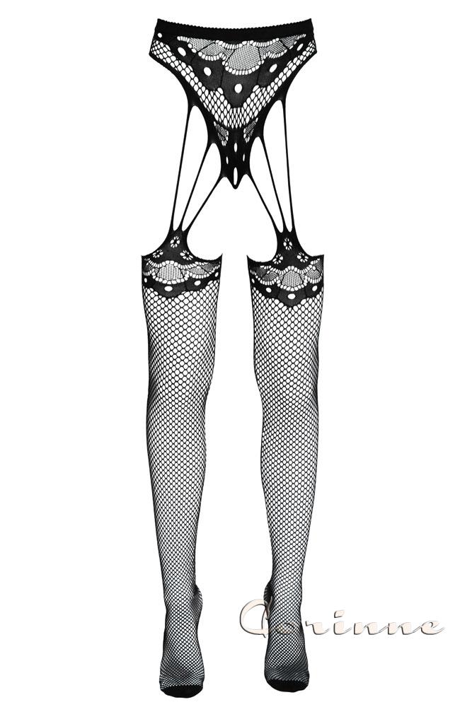 Originale collant composto da un perizoma aperto al cavallo e calze integrate tramite sottili stringhe elasticizzate effetto reggicalze. Realizzato in morbida rete elastica per garantire comfort e seduzione, presenta eleganti dettagli in pizzo sia sul perizoma che sulle calze. Punta rinforzata. Certificazione Oeko-Tex.