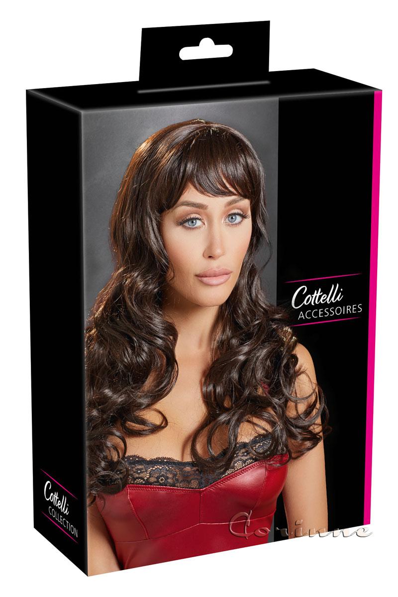 Parrucca marrone scuro con punte ondulate. Realistica e di alta qualità. Lunga circa 55 cm. Lavabile facilmente con acqua e shampoo.