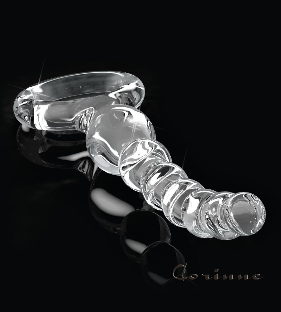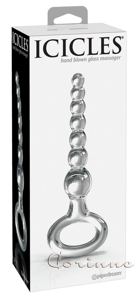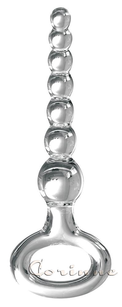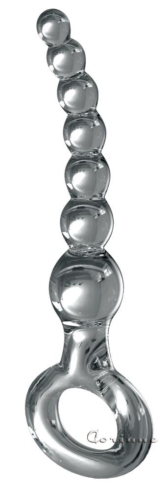 Curved anal beads made out of handblown glass with 7 beads and a handy retraction ring. Odourless, anti-allergenic and very hygienic it's really easy to clean – it can even be put in the dishwasher. Transparent. Complete length 20.5 cm, insertion depth 14 cm, Ø 1.4-3.7 cm. Material: glass.