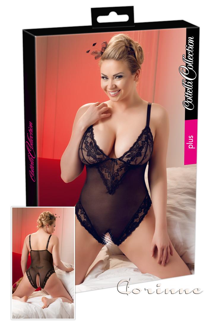 Black powernet body with an open crotch. The cups and material around the legs are decorated with lace. Adjustable straps. 90% polyamide, 10% elastane.