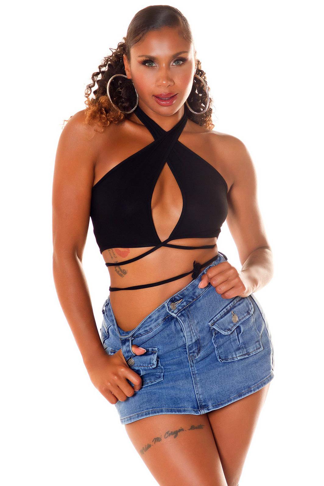 Crop Top Koukla ad incrocio in morbido tessuto nero elasticizzato con apertura frontale all'altezza del seno e legatura posteriore. Taglia unica.