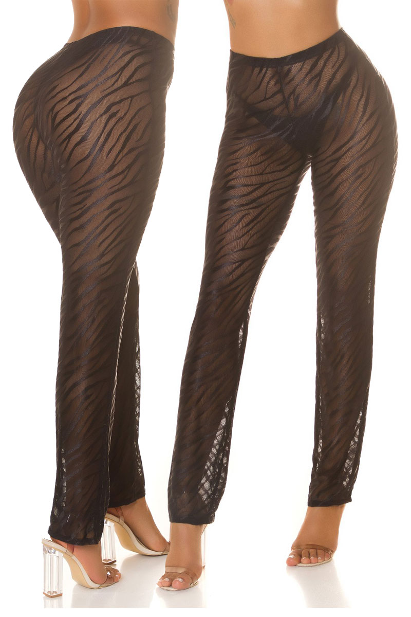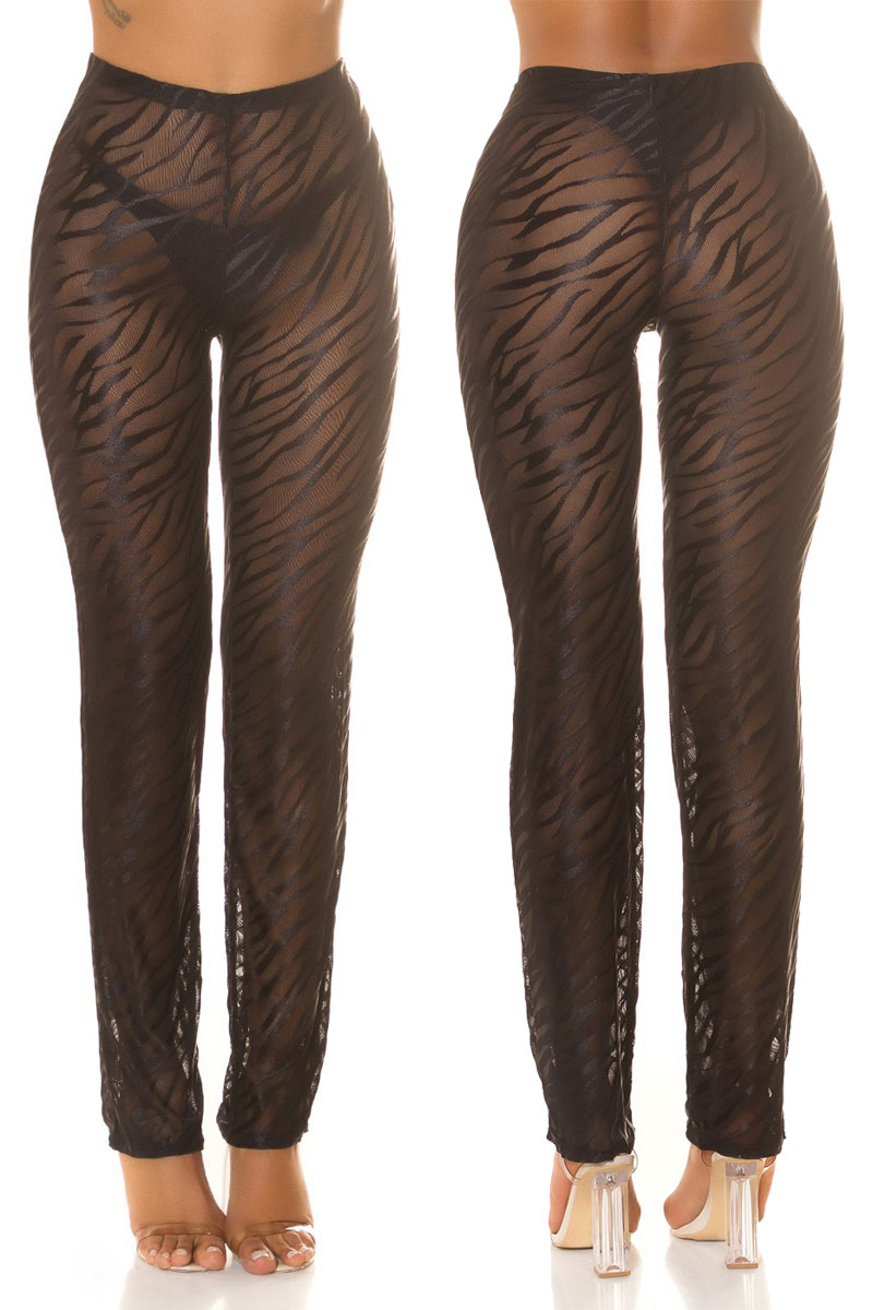 Pantaloni neri trasparenti a vita alta realizzati in tessuto microrete leggermente elastico con fantasia zebrata. Possono essere indossati in discoteca ed in varie feste private o in spiaggia come copricostume.