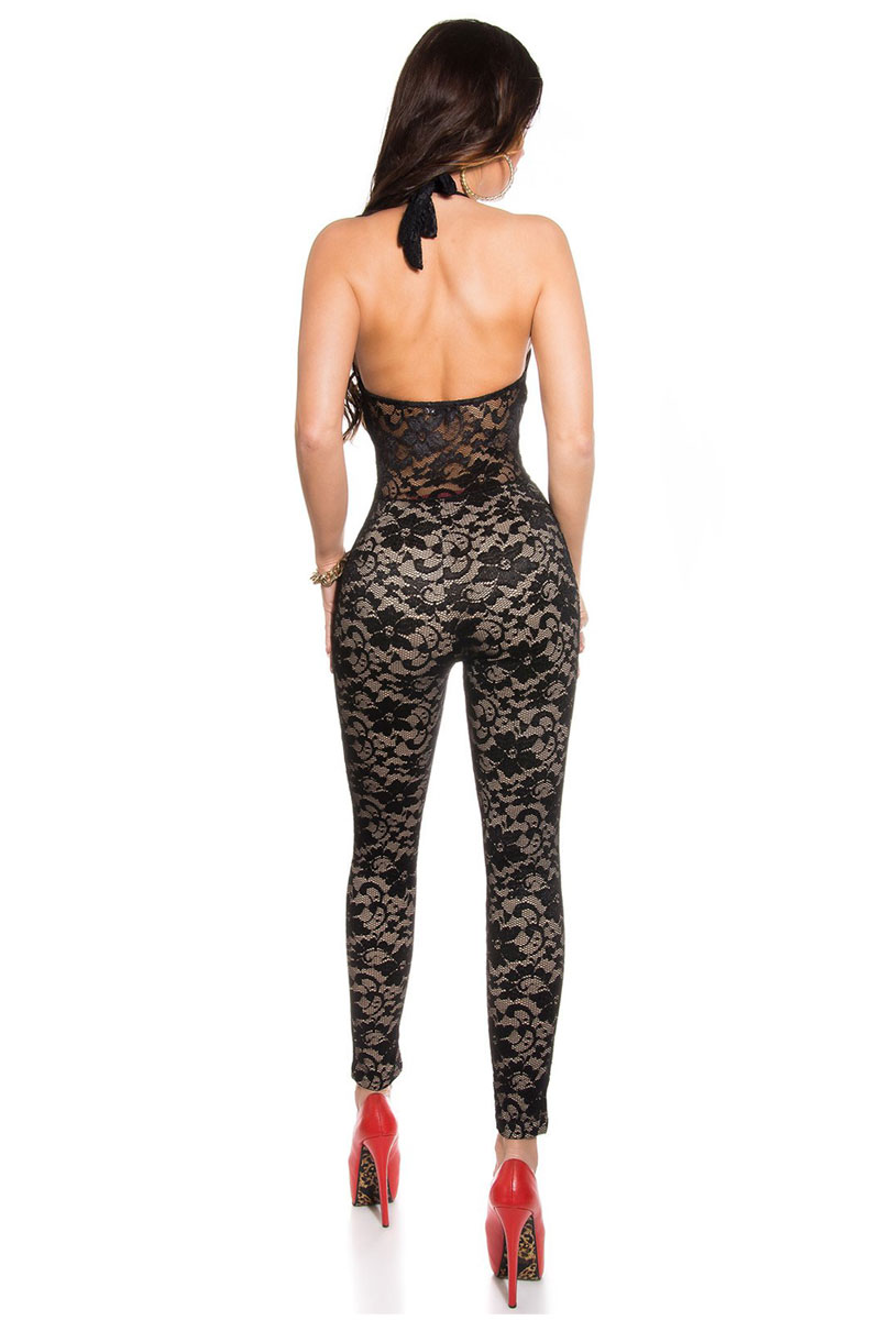 Sensuale e sofisticata: questa tuta intera nero/beige con pizzo crea un elegante effetto vedo-non-vedo che valorizza la silhouette con stile.
