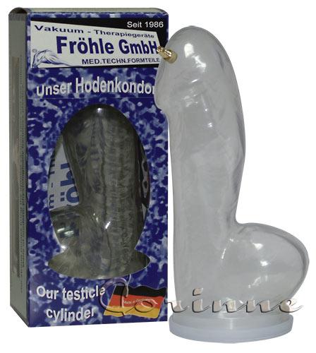 Brand by "Fröhle" for local under-pressure treatment of the penis. Clear glass testicle condom-cylinder for specific potency training, prostate prevention and for increased semen production. 25 cm