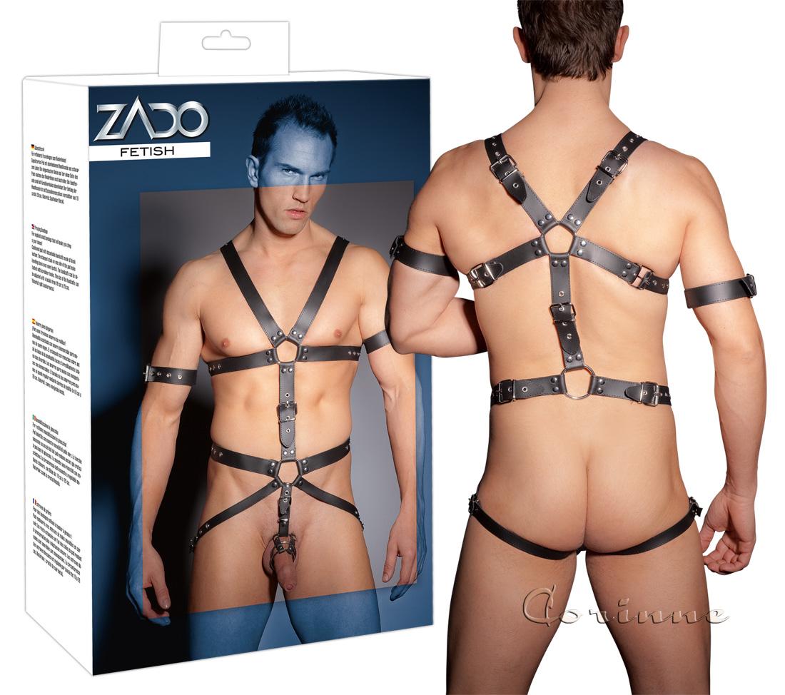 One-piece leather harness consisting of multiple top-stitched, adjustable leather straps with three metal penis/testicle rings (Ø 4 cm, 4.5 cm and 5 cm).