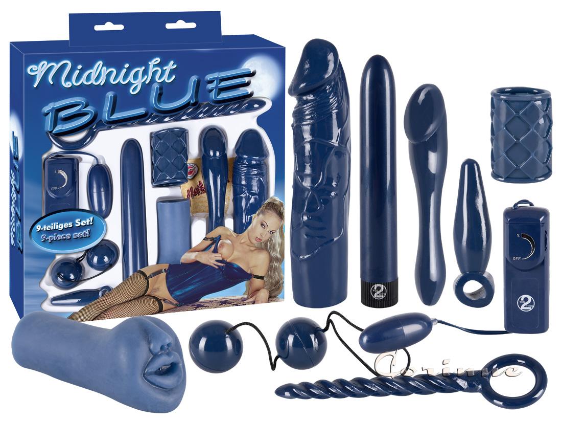 9-piece sex-toy set made of blue gliding material. Power vibrator (length 17.5 cm, Ø 2.5 cm) and much more for exciting nights. Material: TPE, ABS, phthalate-free according to EU Regulation REACH. Batteries included.