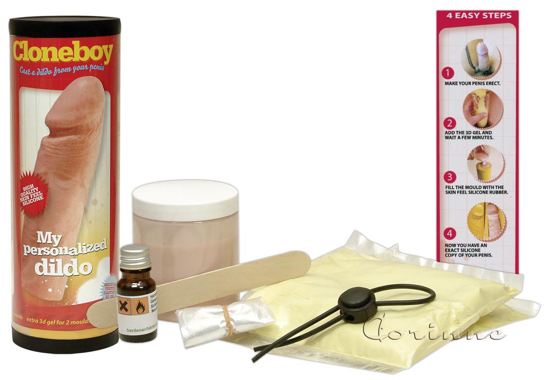 Penis clone set for creating a dildo, consisting of: a penis loop, a cuff, a casting mould, hardening agent, 2 x 3D gels, a silicone rubber, 1 pair of gloves, a wooden spatula and a detailed user manual. Sufficient for a penis size of up to 15 cm (erected) and a Ø of 4 cm.