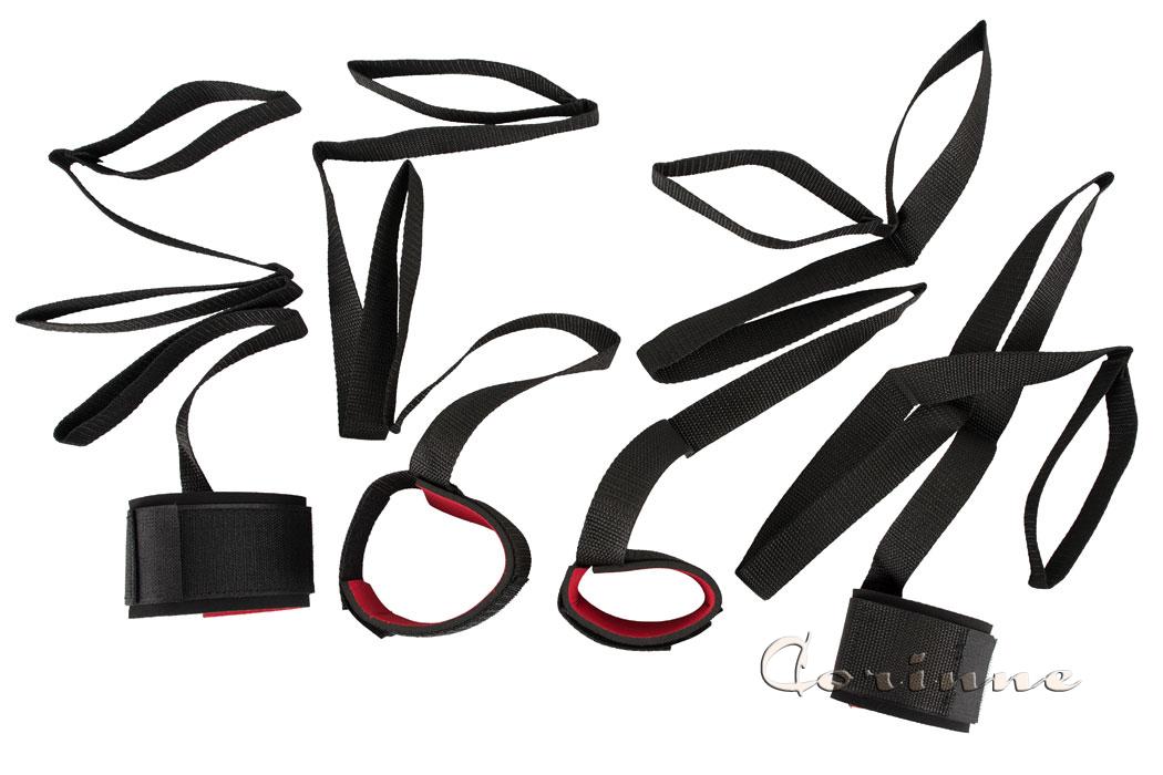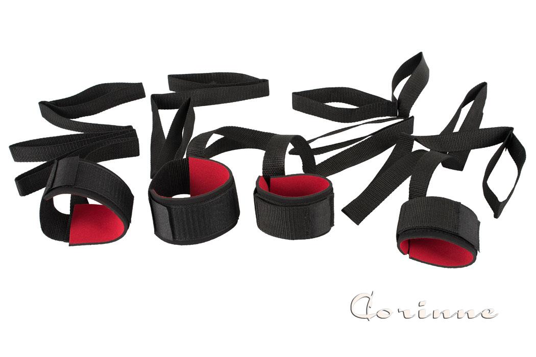 Set bondage composto da 4 pezzi separati per la legatura di polsi e caviglie; chiusura con velcro regolabile. Realizzato in fibra sintetica impermeabile.