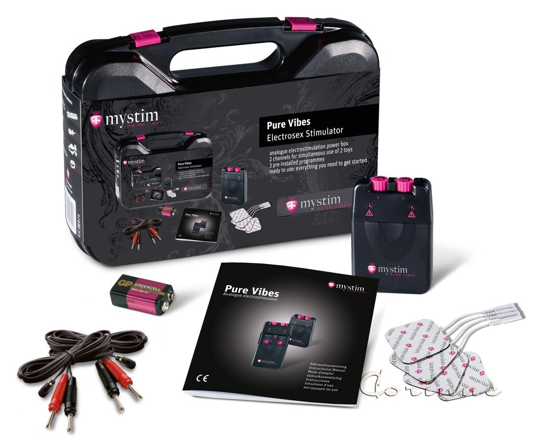 Perfect for electrosex beginners!The Mystim Pure Vibes is a reliable starter device for neverending stimulation from soft tingling, rhythmic pulsating to sensual thrusting, depending on the mode chosen. There are no limitations concerning your imagination and joy of experimenting. Because there are 2 channels, even 2 toys can be employed simultaneously - for more fun alone or as a twosome. In addition to the modes which can be set manually, there are also 3 preset programs. With the Mystim Pure Vibes, anything is possible - from soft to rough.Product information:* 2 separately controllable channels* 3 programs for the satisfaction of individual needs, from tender and intense to hard* intensity, impulse width and frequency are mainly individually controllable* plug rotatable 360° to prevent cable break* with a flexible belt clip* certified in correspondence with the Ordinance concerning Medical Devices CE 0483Scope of supply:* 1 analogue Mystim device for electro-stimulation* 1 sturdy hard shell case made of plastic* 4 self-adhesive electrodes* 2 electrode cables for self-adhesive electrodes* 1 9V-battery* user manual im German, English and FrenchTechnical data:* asymmetric two-phase rectangular impulse* intensity: 0 - 80 mA* frequency range: 2 - 150 Hz* impulse width: 30 - 260 µs* weight: 110 g incl. battery* size: 95 x 65 x 25 mm (length x width x height)* battery required: 9V battery