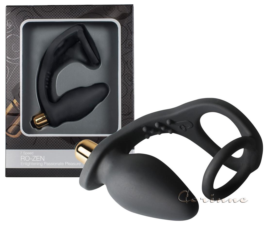 Double ring with anal vibrator. Black. Total length approx. 14 cm. ø of the flexible rings 3.1 and 3.7 cm. Waterproof. Material: silicone, free of phthalates according to EU Regulation REACH. Batteries included.