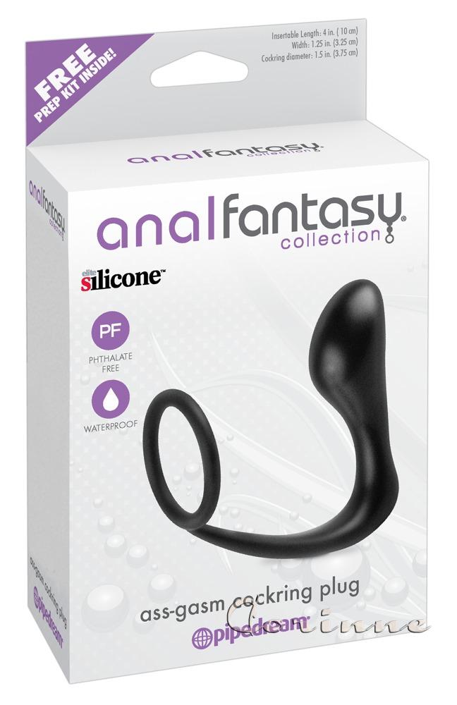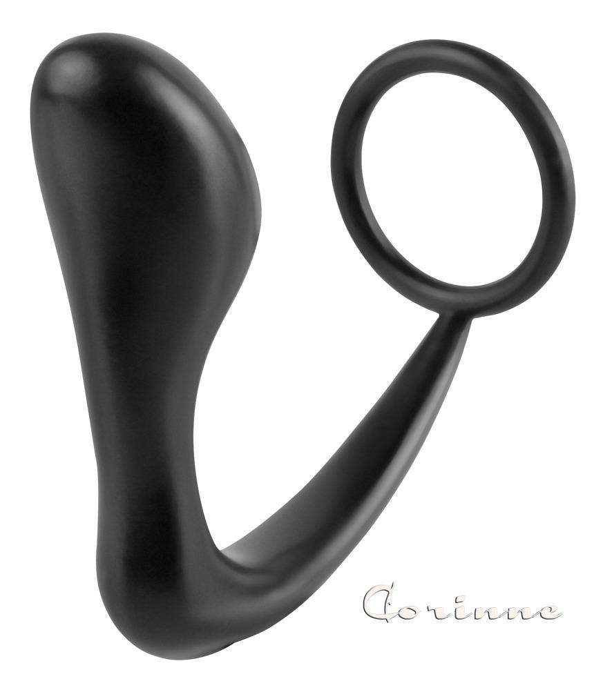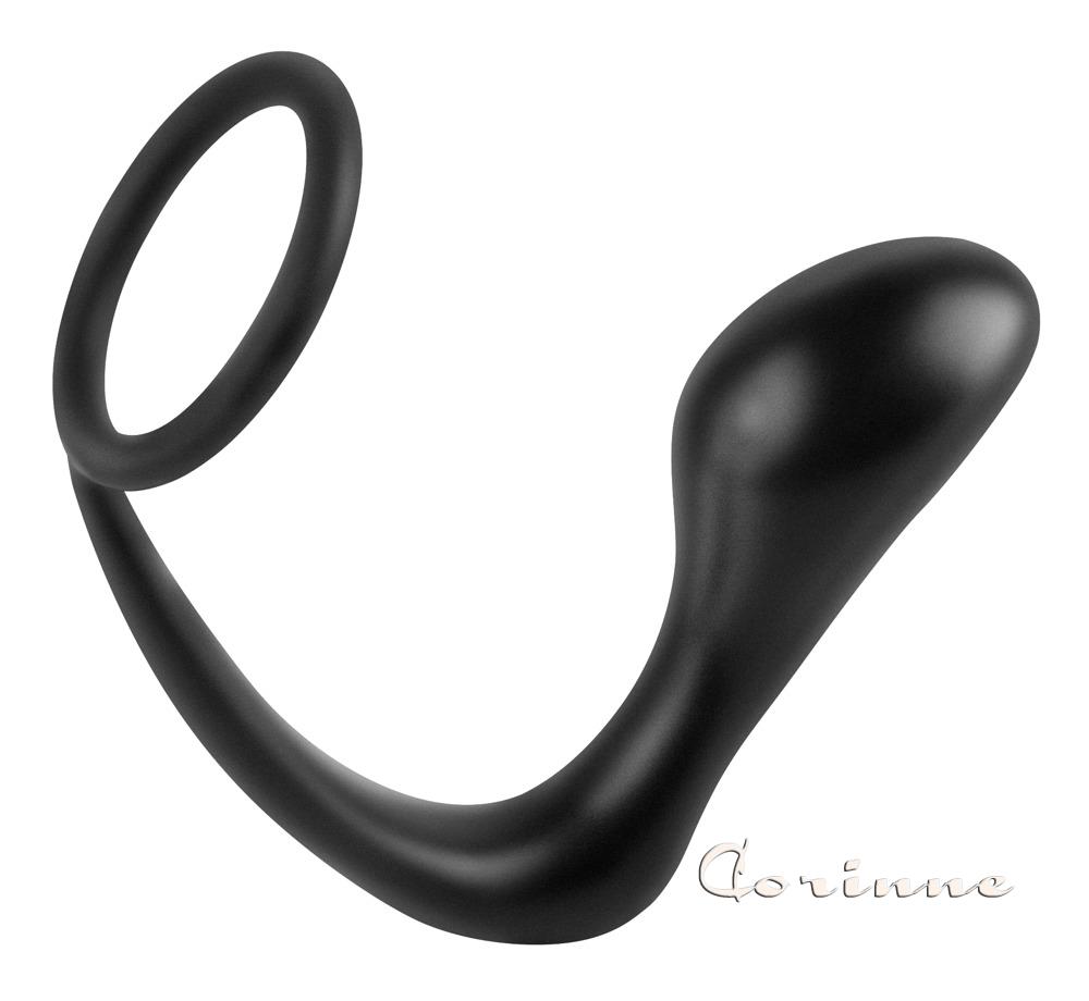 Cock ring with butt plug for P-spot stimulation. Black. Complete length 10.4 cm, plug insertion depth 8.3 cm, plug Ø 1.5-3.4 cm, ring Ø 3.8 cm (flexible), ring thickness 6 mm. Silicone with a PU coating, phthalate-free according to EU Regulation REACH.