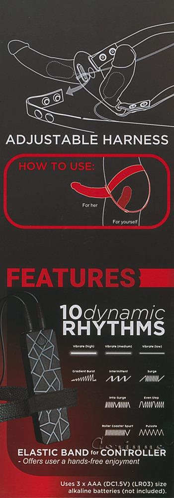 Black strap-on vibrator with a large outer vibrator and a small inner vibrator. The large vibrator (17 cm long, Ø 3-4.3 cm) is slightly curved and is used for penetrating a partner (the passive one). The small vibrator (9.3 cm long, Ø 3.8-4.2 cm) penetrates the person wearing the harness (the active one). Both vibrators have bulging glans, pronounced veins and 10 vibration modes that can be controlled with the remote control on a wire. The remote control can be placed into the small loop on the harness so that the hands are free to do other things. There are 12 holes in the harness so that the circumference can be adjusted from 78 cm to 108 cm. The string is 96 cm long and can be adjusted to fit.