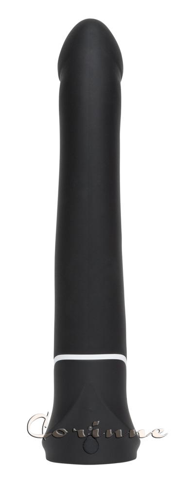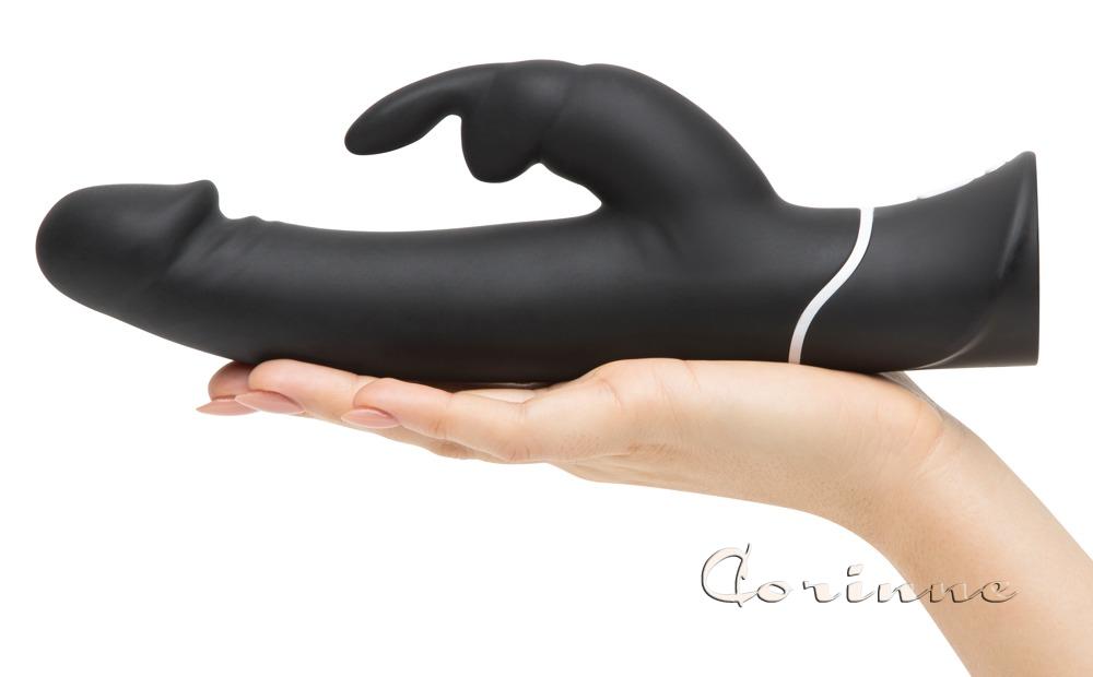 Black rabbit vibrator in a slightly curved shape. With a glans-shaped tip and rabbit-shaped clitoral stimulator. There is a motor in the stimulation arm and the shaft. The stimulation arm has 3 speeds and the shaft has 12 vibration modes. With a travel lock. It can be recharged with the included USB cable. Waterproof. Length 25.5 cm, Ø 4.2 cm. Silicone with a PU coating, phthalate-free according to EU Regulation REACH.