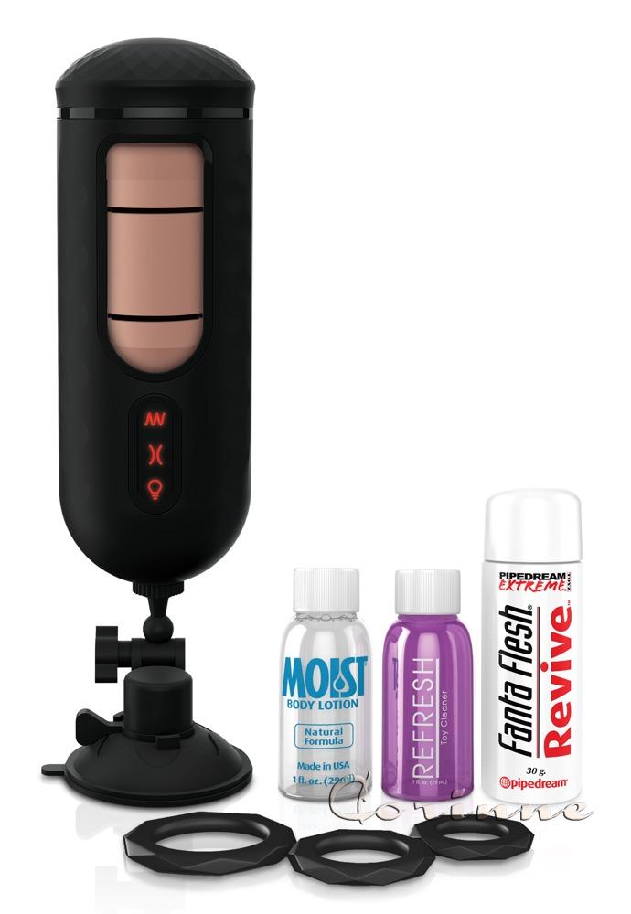 The rechargeable masturbator has an adjustable suction sup, 6 milking speeds, 7 vibration modes and a transparent window to enjoy an LED light show during use. All functions can be controlled separately at the push of a button. 23.9 cm long, 8.4 cm wide. Inner Ø 5.9 cm. Penetration depth: 15.2 cm. Ø pleasure tunnel very flexible. TPU, ABS.Rechargeable with the included USB cable.